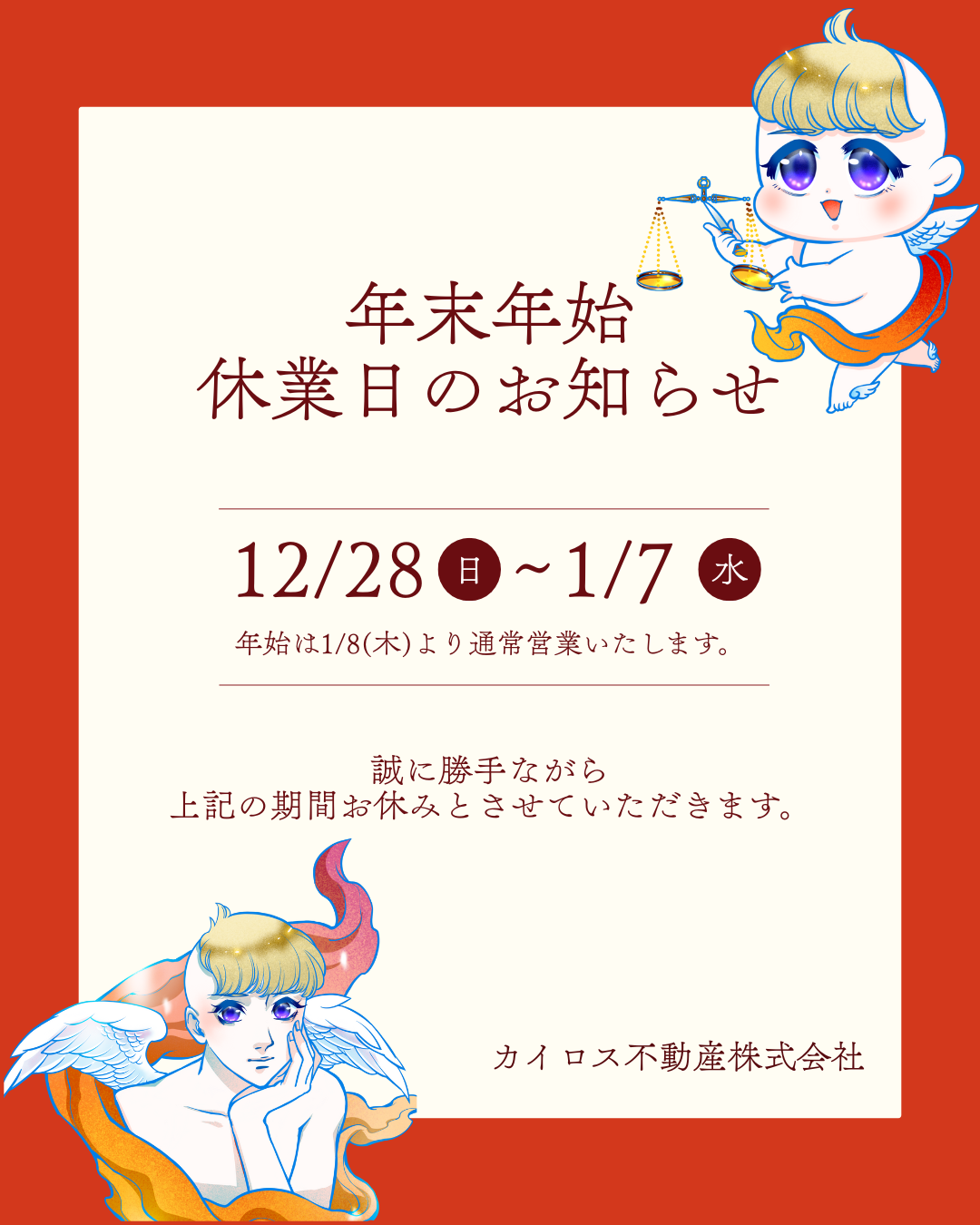 2025.12.27 年末年始休業日のお知らせ 本年も多くの皆さまに支えていただき、誠にありがとうございました。おかげさまで、日々やりがいを感じながら仕事に取り組み、無事に一年を終えることができました。心より感謝申し上げます。 来年も一つひとつのご縁を大切にし、より良いご提案ができるよう努めてまいります。引き続き、どうぞよろしくお願いいたします。 カイロス不動産株式会社 大道 啓代 一覧に戻る